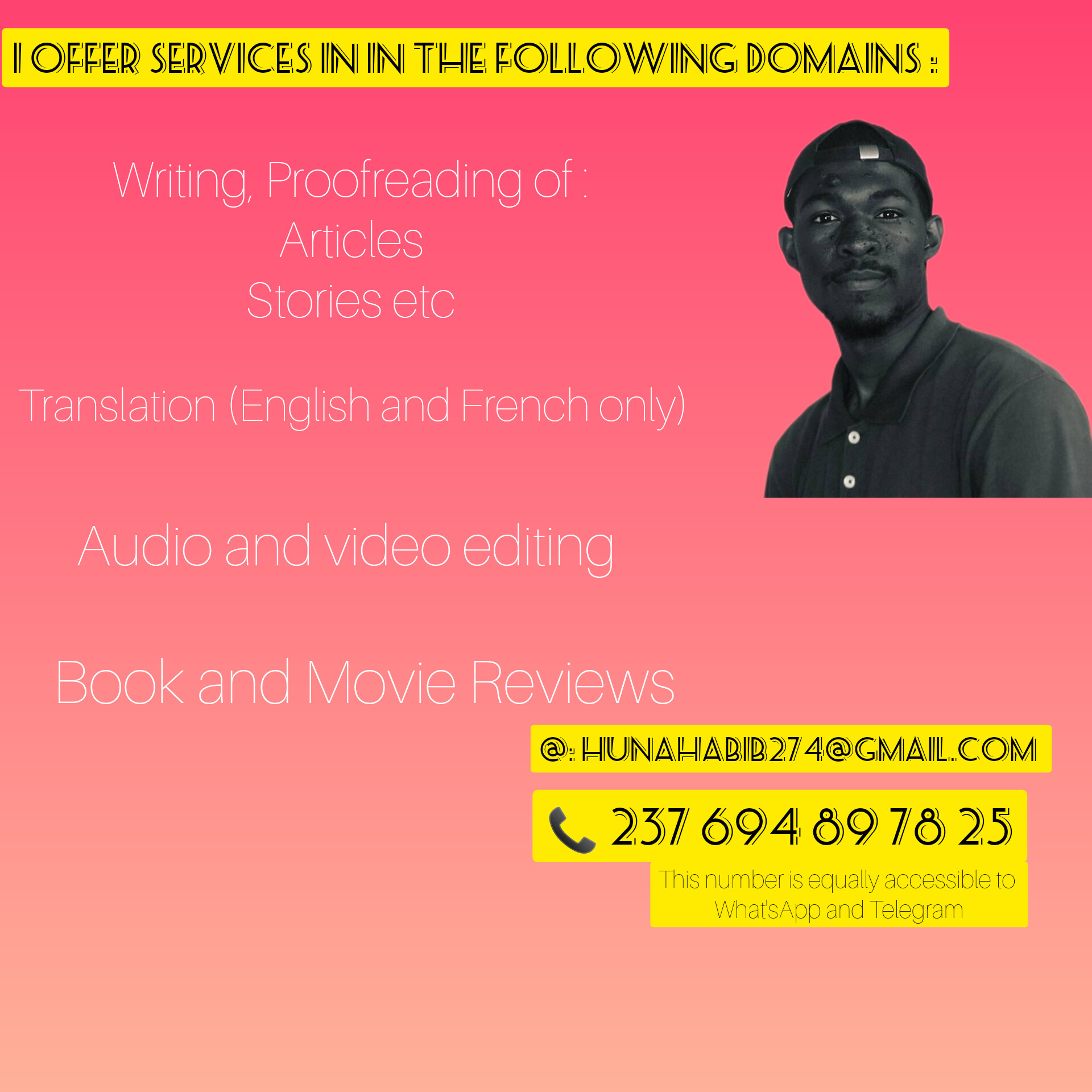 I am a student in economics and management at PK Fokam Emana, I am bilingual, I really like working and helping people....